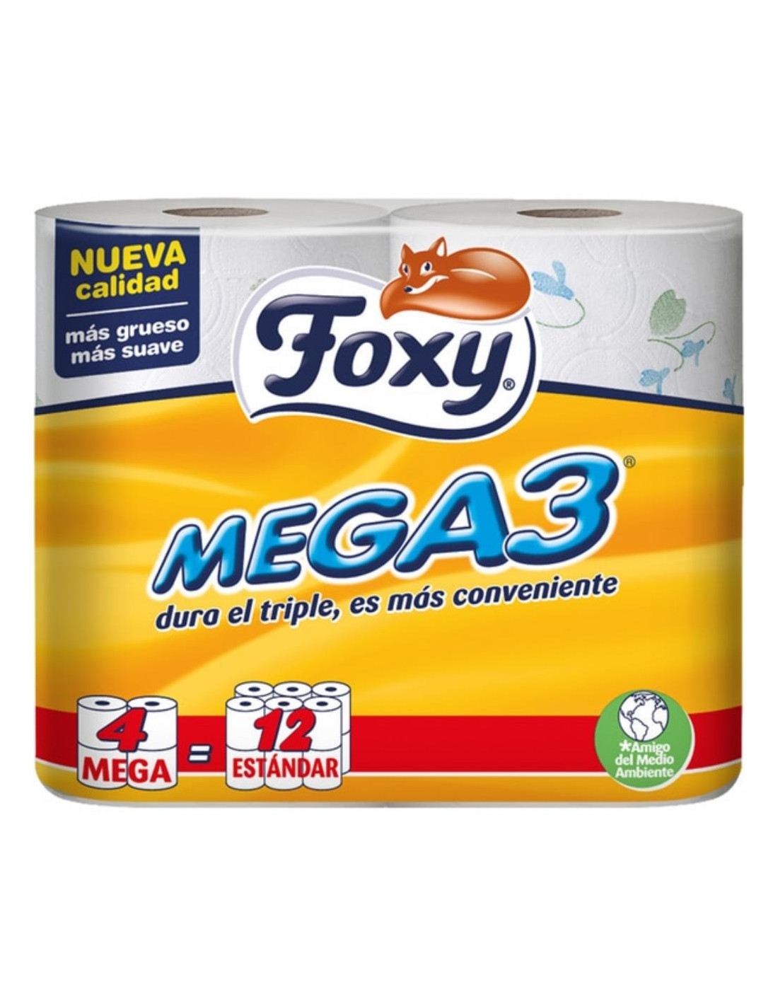 Foxy Mega es el aliado ideal para optimizar el espacio y el tiempo. Gracias a su tecnología de ultra-compactado, cada uno de estos 4 rollos contiene 50 metros de papel, lo que equivale a la longitud de 3 rollos estándar en uno solo. Fabricado con dos capas de pura celulosa virgen, ofrece un equilibrio perfecto entre una suavidad delicada con la piel y una resistencia superior.