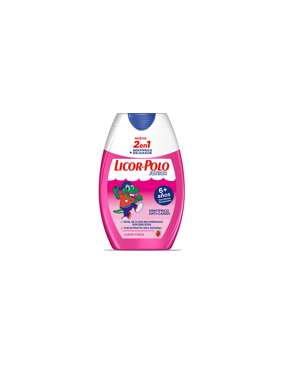 Licor del Polo Junior combina en un solo producto la eficacia de una pasta de dientes con la frescura de un elixir bucal. Su fórmula 2 en 1 está adaptada a las necesidades de los niños, proporcionando la cantidad exacta de flúor necesaria para fortalecer el esmalte de los dientes de leche y los primeros dientes definitivos, protegiéndolos eficazmente contra las caries y la placa.